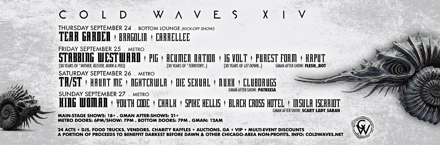 COLD WAVES is a celebration of Chicago’s relationship with industrial music, the memory of a fallen brother, and a fundraiser for suicide prevention charities. In the summer of 2012, Chicago lost one of its most loved and respected sound engineers and musicians, Jamie Duffy. His work ethic and ingenuity in the local music scene was a gift to many musicians. His abrupt passing had a profound effect on the electronic and metal music families he meant so much to. In need of healing and hope, we brought 14 bands together for one magical night that year to raise money for Jamies family and say goodbye. But in the end, it was more of an awakening... a rebirth... a breaking wave. The success of the show pushed us to build it into an annual event, stretching over a weekend and moving it to Chicago's iconic Metro, and eventually stretching to events in Los Angeles, New York and beyond. 10 years later... COLD WAVES continues to shake the pillars of heaven by collecting the bands, styles, sounds and attitudes that Jamie held dear, and cement the sound of a Chicago institution alive and well. From Wax Trax! and Medusas to Uncle Al and Chicago Trax, this is our history and our future, the melding of man, woman and machine, the sound of melody, muscle and hate, basking in the glow of attack ships on fire down the shores of pluto.