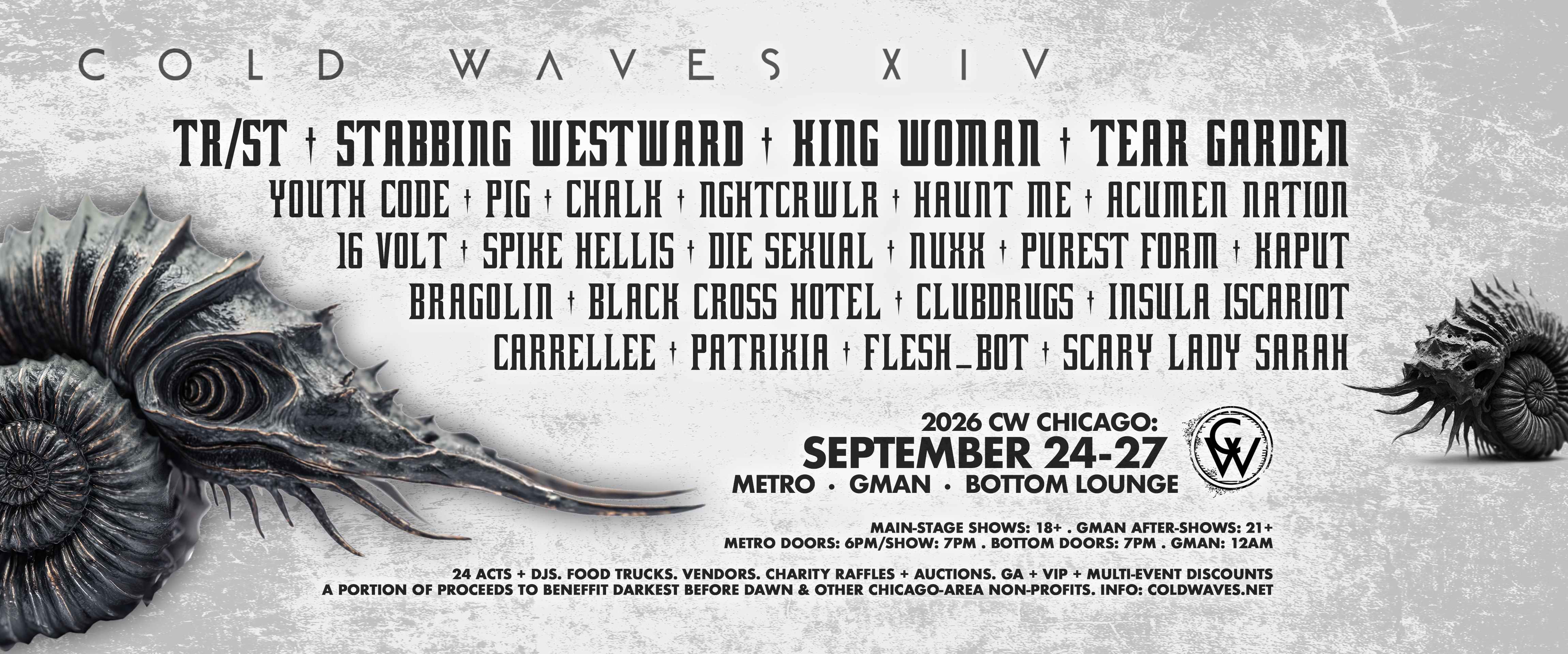 COLD WAVES is a celebration of Chicago’s relationship with industrial music, the memory of a fallen brother, and a fundraiser for suicide prevention charities. In the summer of 2012, Chicago lost one of its most loved and respected sound engineers and musicians, Jamie Duffy. His work ethic and ingenuity in the local music scene was a gift to many musicians. His abrupt passing had a profound effect on the electronic and metal music families he meant so much to. In need of healing and hope, we brought 14 bands together for one magical night that year to raise money for Jamies family and say goodbye. But in the end, it was more of an awakening... a rebirth... a breaking wave. The success of the show pushed us to build it into an annual event, stretching over a weekend and moving it to Chicago's iconic Metro, and eventually stretching to events in Los Angeles, New York and beyond. 10 years later... COLD WAVES continues to shake the pillars of heaven by collecting the bands, styles, sounds and attitudes that Jamie held dear, and cement the sound of a Chicago institution alive and well. From Wax Trax! and Medusas to Uncle Al and Chicago Trax, this is our history and our future, the melding of man, woman and machine, the sound of melody, muscle and hate, basking in the glow of attack ships on fire down the shores of pluto.